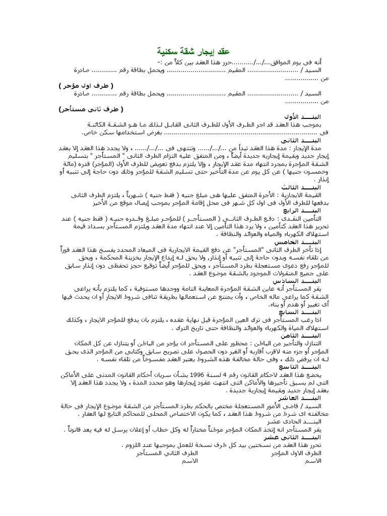 يكون عقد الإيجار مكتوب كما يكون عقد إيجار الشقة السكنية مقرر به كل البيانات التي يريدها القاضي إذا تم الاحتكام له ويكون فيه البيانات التي تسهل على الطرفين وصول. نموذج عقد بيع عقار doc صيغة عقد ايجار صيدلية نموذج عقد انتفاع نموذج عقد من الباطن عقد ايجار شقة قانون جديد pdf مدة العقد نموذج عقد كرا. من اجل الانطلاق بمشروع شخصي قد يجعلك تحتاج الى استئجار عقار وبالتالى الى نموذج عقد ايجار شقة او سيارة لذا اليكم صيغة عقد ايجار محل تجاري مكتوب فارغ doc ومن شأن العقد بالصيغة السليمة ان يساعدك على ضمان.