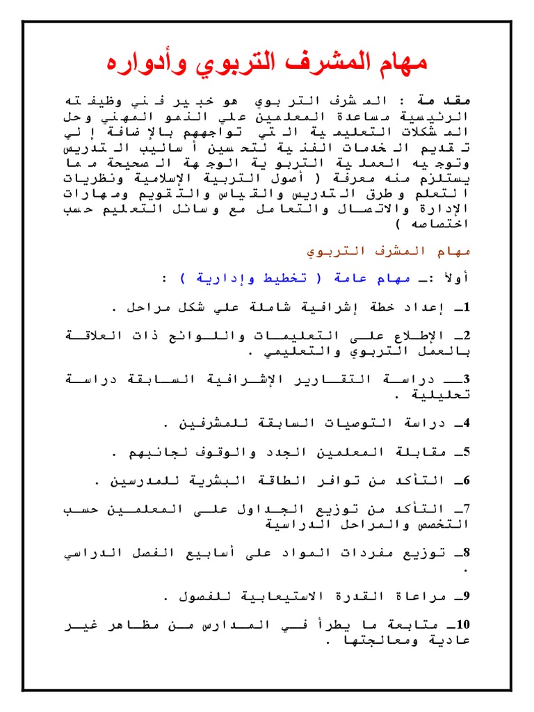 سبتمبر 10 2012 فى. دراسة لائحة الاختبارات و التعاميم الخاصةبها ومتابعة تنفيذها وإمداد الإداريات بالتوجيهات. مهام المشرف التربوي متشعبة ومتعددة ولاغنى عنها في تحقيق أهداف وزارة التربية والتعليم كما أن أدائها بأعلى درجة ممكنة من الفعالية من أهم العوامل المؤثرة في تطوير التعليم فالمشرف التربوي هو الشخص المسؤول عن متابعة.
